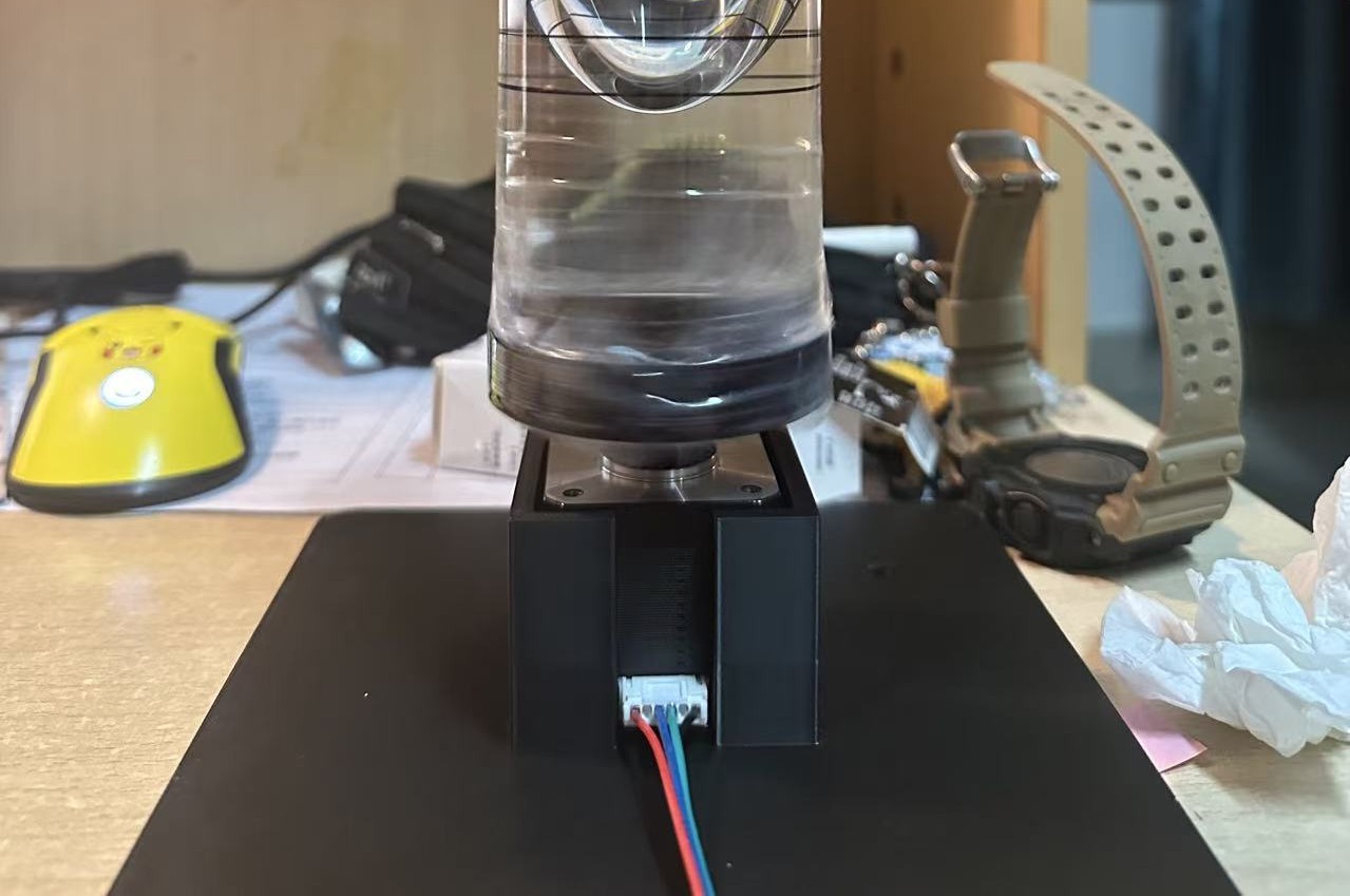 I used a stepper motor to control the angular speed of a water tube and investigated the relationship between the water surface gradient and angular speed. I also designed an aesthetic container for this device using 3D printing.